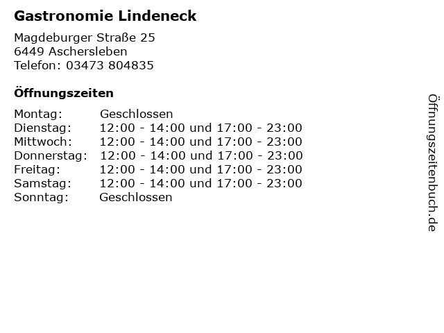 | Öffnungszeiten Gastronomie Lindeneck in Aschersleben anzeigen | |