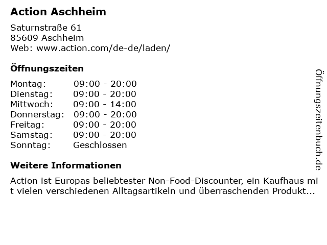 | Öffnungszeiten Action Aschheim in Aschheim anzeigen | |
