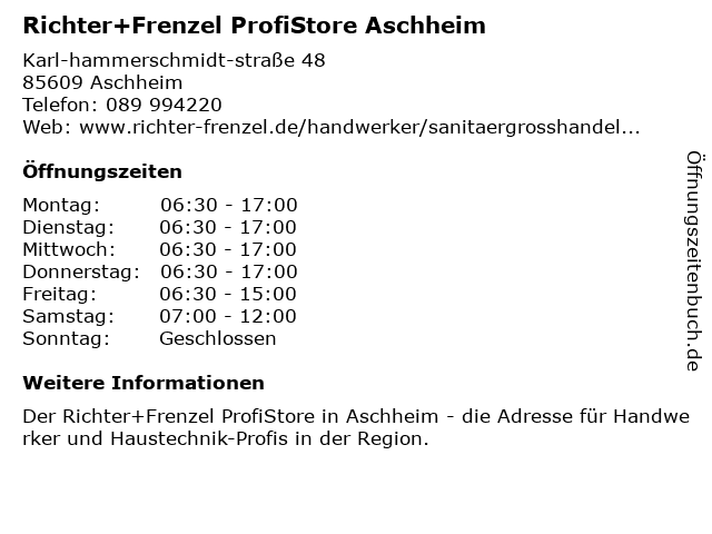 1 Richter+Frenzel BäderStore Aschheim (Entfernung: 0,00 km) Karl-hammerschmidt-straße 48, 85609 Aschheim 2 Richter+Frenzel - Niederlassung (Entfernung: 0,04 km) Karl-Hammerschmidt-Straße 51, 85609 Aschheim-Dornach 6 |