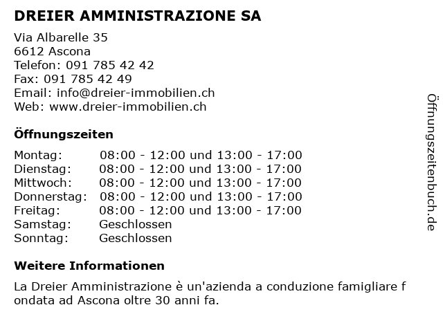 | Öffnungszeiten DREIER AMMINISTRAZIONE SA in Ascona anzeigen | |