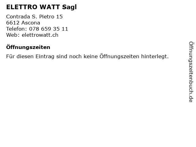 | Öffnungszeiten ELETTRO WATT Sagl in Ascona anzeigen | |