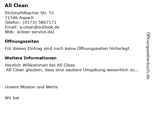 | Öffnungszeiten All Clean in Aspach anzeigen | |