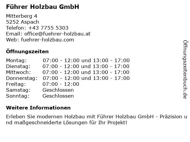| Öffnungszeiten Führer Holzbau GmbH in Aspach anzeigen | |