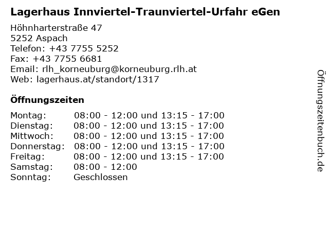 2 Lagerhaus Innviertel-Traunviertel-Urfahr eGen (Entfernung: 19,45 km) Industriezeile 33, 5280 Braunau am Inn 3 Lagerhaus Innviertel-Traunviertel-Urfahr eGen - Holzeinkauf (Entfernung: 0,00 km) Höhnharterstraße 47, 5252 Aspach 4 Lagerhaus Innviertel-Traunviertel-Urfahr eGen - Baustoffe (Entfernung: 10,16 km) Moosham 35, 4943 Geinberg 5 Lagerhaus Innviertel-Traunviertel-Urfahr eGen - Genol Tankstelle (Entfernung: 13,85 km) Gewerbestraße 1, 4962 Mining 6 Lagerhaus Innviertel-Traunviertel-Urfahr eGen - Baustoffe (Entfernung: 13,85 km) Gewerbestraße 1, 4962 Mining |