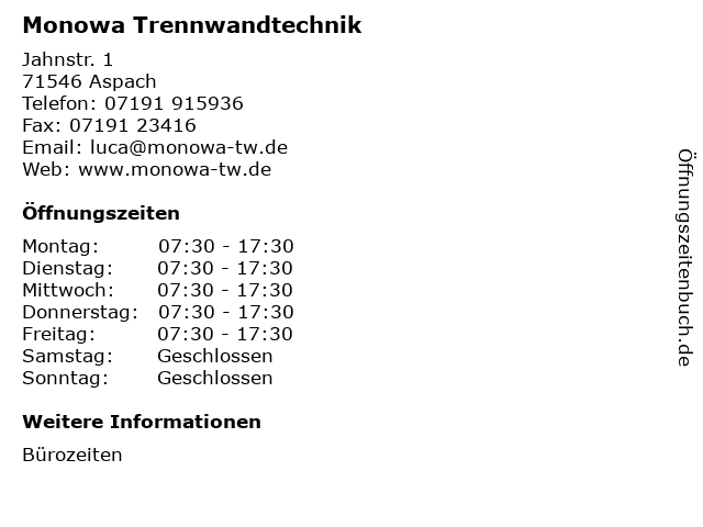 | Öffnungszeiten Monowa Trennwandtechnik in Aspach anzeigen | |