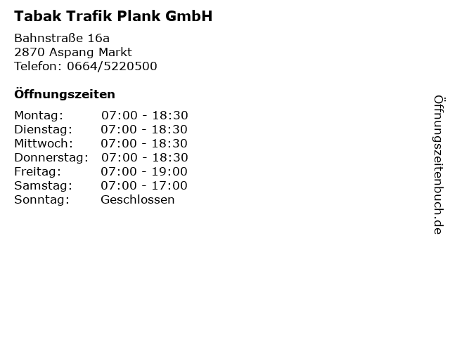 | Öffnungszeiten Tabak Trafik Plank GmbH in Aspang Markt anzeigen | |