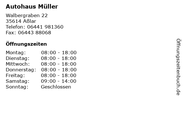 | Öffnungszeiten Autohaus Müller in Aßlar anzeigen | |