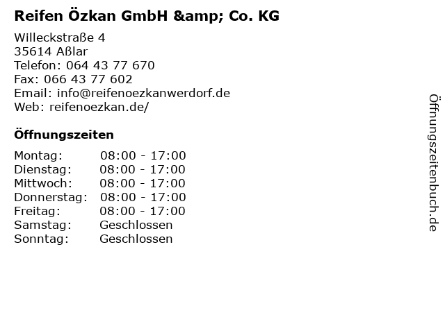 | Öffnungszeiten Reifen Özkan GmbH & Co. KG in Aßlar anzeigen | |