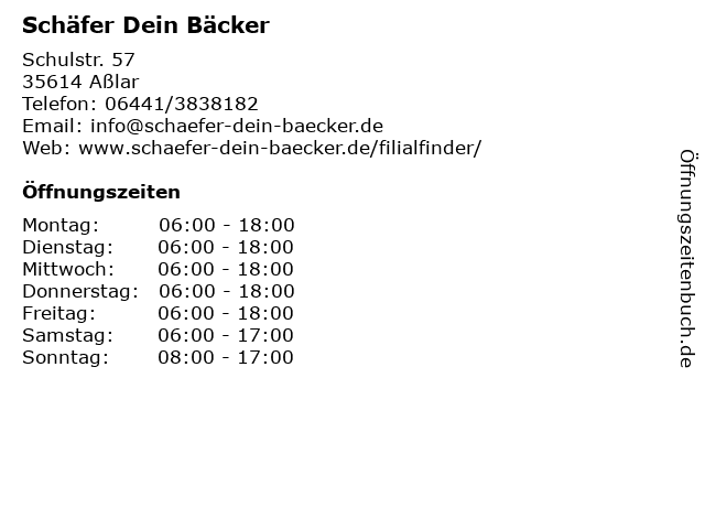 | Öffnungszeiten Schäfer Dein Bäcker in Aßlar anzeigen | |