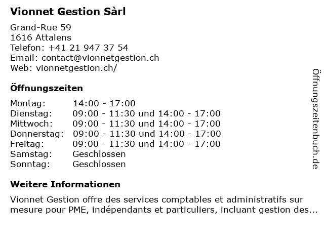 | Öffnungszeiten Vionnet Gestion Sàrl in Attalens anzeigen | |