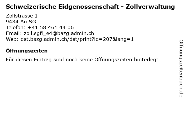 1 Schweizerische Eidgenossenschaft - Zollverwaltung (Entfernung: 2,55 km) Altfeldstrasse 13, 9430 St. Margrethen SG 2 3 Schweizerische Eidgenossenschaft - Zollverwaltung (Entfernung: 2,75 km) Grenzstrasse 33, 9430 St. Margrethen SG 4 Schweizerische Eidgenossenschaft - Zollverwaltung (Entfernung: 2,75 km) Dammstrasse 25, 9430 St. Margrethen SG 5 Schweizerische Eidgenossenschaft - Zollverwaltung (Entfernung: 4,78 km) Rheinstrasse 63, 9444 Diepoldsau 6 Schweizerische Eidgenossenschaft - Zollverwaltung (Entfernung: 6,31 km) Hohenemserstrasse 69, 9444 Diepoldsau |