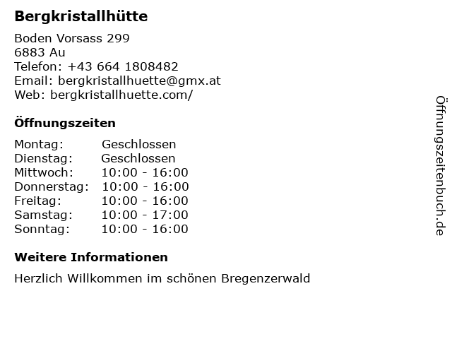 | Öffnungszeiten Bergkristallhütte in Au anzeigen | |
