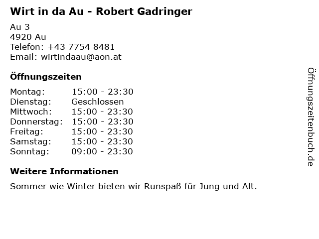 | Öffnungszeiten Wirt in da Au - Robert Gadringer in Au anzeigen | |