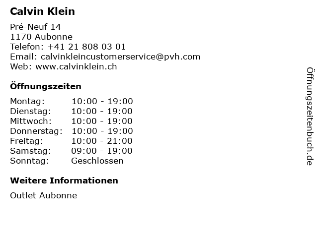 | Öffnungszeiten Calvin Klein in Aubonne anzeigen | |