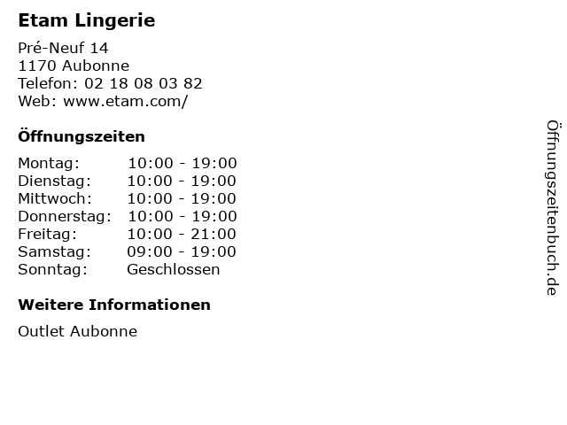 | Öffnungszeiten Etam Lingerie in Aubonne anzeigen | |