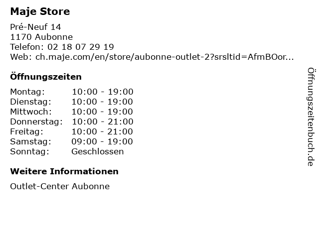 | Öffnungszeiten Maje Store in Aubonne anzeigen | |