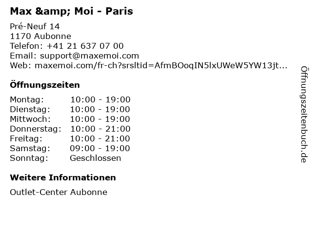| Telefonnummer Max & Moi - Paris in Aubonne (+41 21 637 07 00) anrufen | |