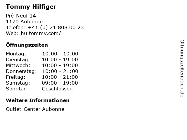 | Öffnungszeiten Tommy Hilfiger in Aubonne anzeigen | |