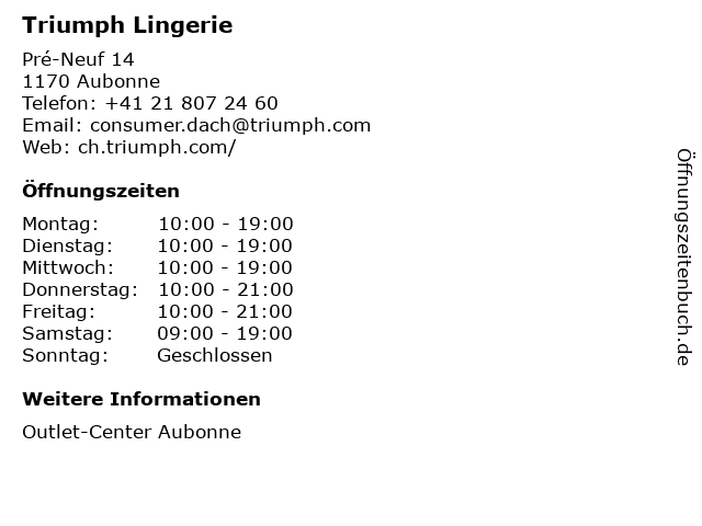 | Öffnungszeiten Triumph Lingerie in Aubonne anzeigen | |