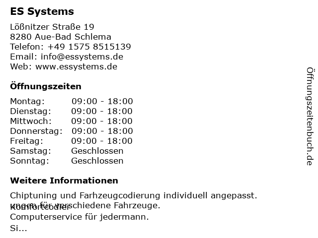 | Öffnungszeiten ES Systems in Aue-Bad Schlema anzeigen | |