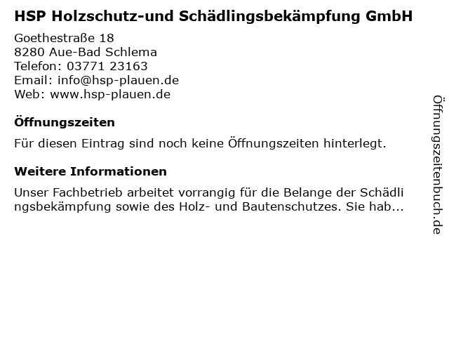 | HSP Holzschutz-und Schädlingsbekämpfung GmbH anrufen | |