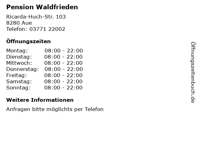 | Öffnungszeiten Pension Waldfrieden in Aue anzeigen | |