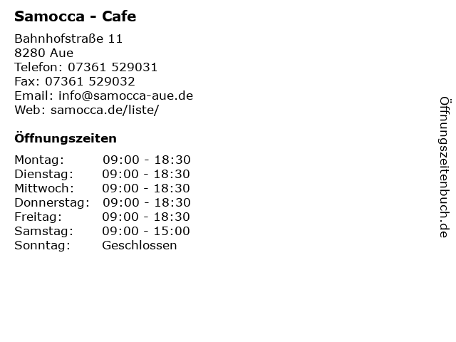 | Öffnungszeiten Samocca - Cafe in Aue anzeigen | |