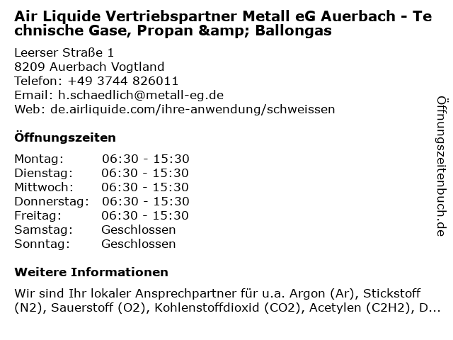 1 AIR LIQUIDE Deutschland GmbH - Metall eG Gewerbegebiet Auerbach-Rebesgrün (Entfernung: 0,01 km) Leerser Straße 1, 08209 Auerbach /Vogtl. 2 Ulrich Wolf Metall- und Maschinenbau (Entfernung: 6,40 km) Johann-Sebastian-Bach-Str. 49, 08233 Treuen 3 AIR LIQUIDE Deutschland GmbH - Maschinenbau Kolbe GmbH (Entfernung: 9,18 km) Irfersgrüner Straße 15, 08485 Waldkirchen 6 AIR LIQUIDE Deutschland GmbH - Jörg Gemeinhardt Techn. Gase und Propan (Lieferservice) (Entfernung: 15,67 km) Altjocketaer Straße 8a, 08543 Pöhl OT Ruppertsgrün |