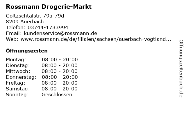 | Öffnungszeiten Rossmann Drogerie-Markt in Auerbach anzeigen | |