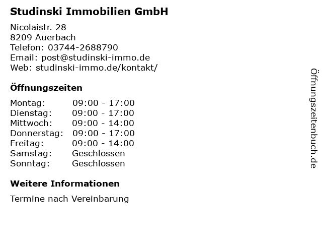 | Öffnungszeiten Studinski Immobilien GmbH in Auerbach anzeigen | |