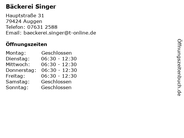 | Öffnungszeiten Bäckerei Singer in Auggen anzeigen | |
