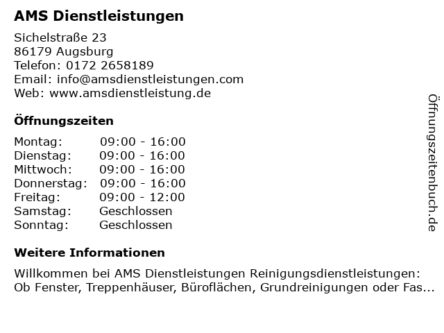 | Öffnungszeiten AMS Dienstleistungen in Augsburg anzeigen | |