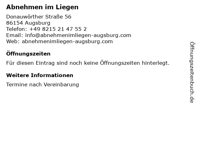 | Öffnungszeiten Abnehmen im Liegen in Augsburg anzeigen | |