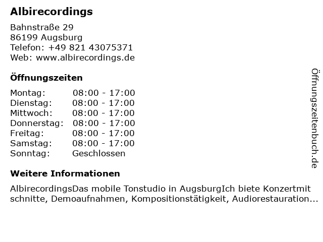 | Öffnungszeiten Albirecordings in Augsburg anzeigen | |