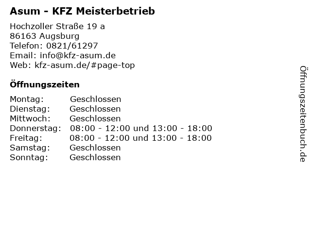 | Öffnungszeiten Asum - KFZ Meisterbetrieb in Augsburg anzeigen | |