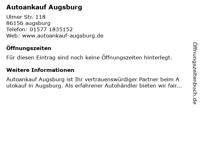 | Öffnungszeiten Autoankauf Augsburg in augsburg anzeigen | |
