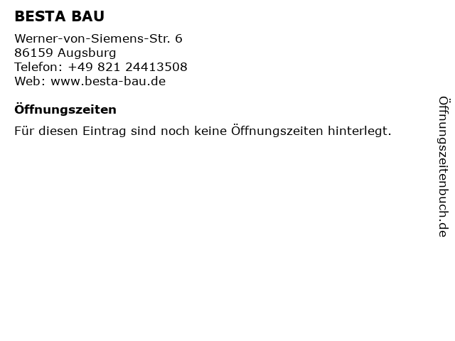 | Öffnungszeiten BESTA BAU in Augsburg anzeigen | |
