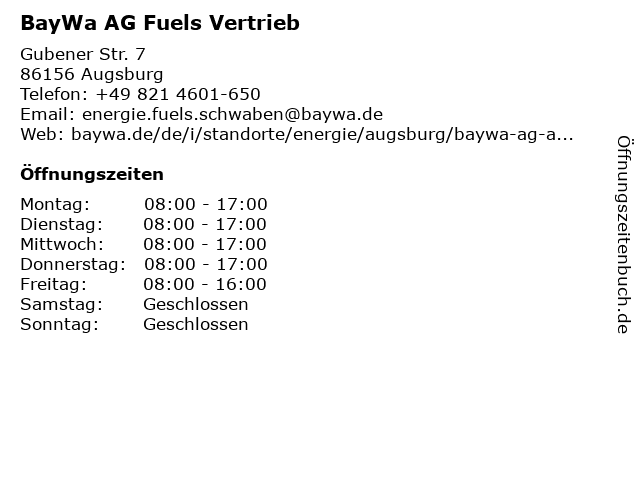 | Öffnungszeiten BayWa AG Fuels Vertrieb in Augsburg anzeigen | |