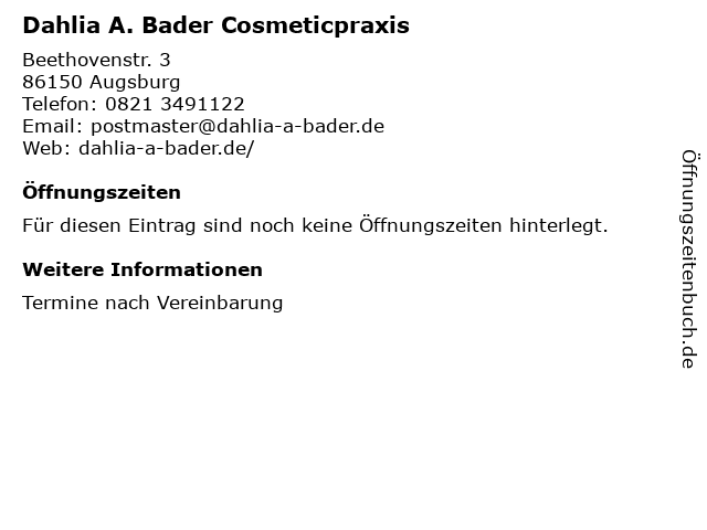 | Dahlia A. Bader Cosmeticpraxis anrufen | |