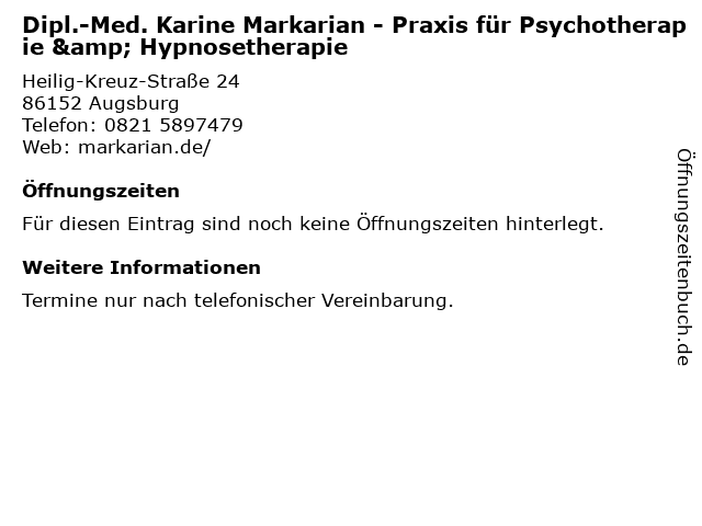 | Dipl.-Med. Karine Markarian - Praxis für Psychotherapie & Hypnosetherapie anrufen | |