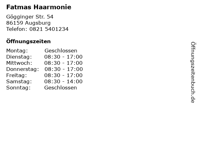 | Öffnungszeiten Fatmas Haarmonie in Augsburg anzeigen | |