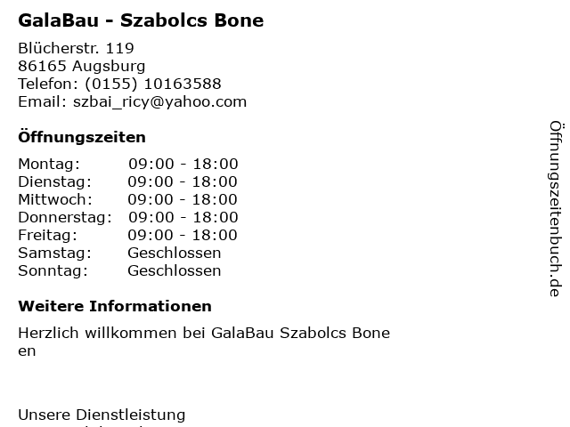 | Öffnungszeiten GalaBau - Szabolcs Bone in Augsburg anzeigen | |