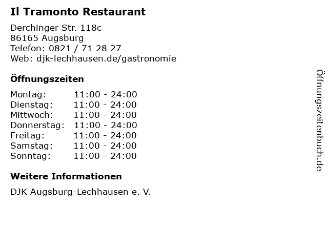 | Öffnungszeiten Il Tramonto Restaurant in Augsburg anzeigen | |