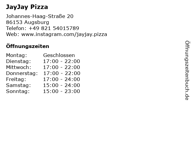 | Öffnungszeiten JayJay Pizza in Augsburg anzeigen | |
