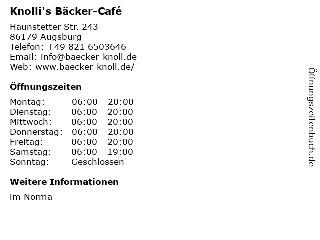 Öffnungszeiten Knolli's Bäcker-Café in Augsburg anzeigen | |