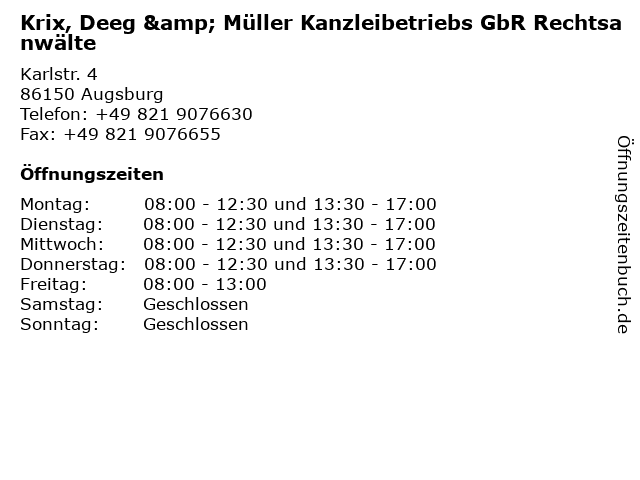 6 Große und Partner - Rechtsanwälte und Steuerberater (Entfernung: 0,00 km) Karlstraße 4, 86150 Augsburg |