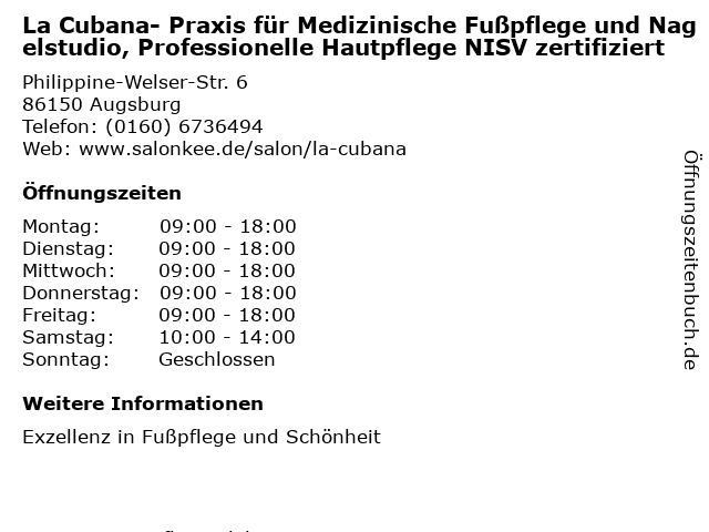 Branchen & Suchbegriffe zu La Cubana- Praxis für Medizinische Fußpflege und Nagelstudio, Professionelle Hautpflege NISV zertifiziert:cubana, cubana-, fußpflege, fußpflege im medizinischen bereich, gesichtsbehandlung, gesichtspflege, hautpflege, la, medizinische, nagelstudio, nisv, praxis, professionelle, wimpernverlängerung, zertifiziert |