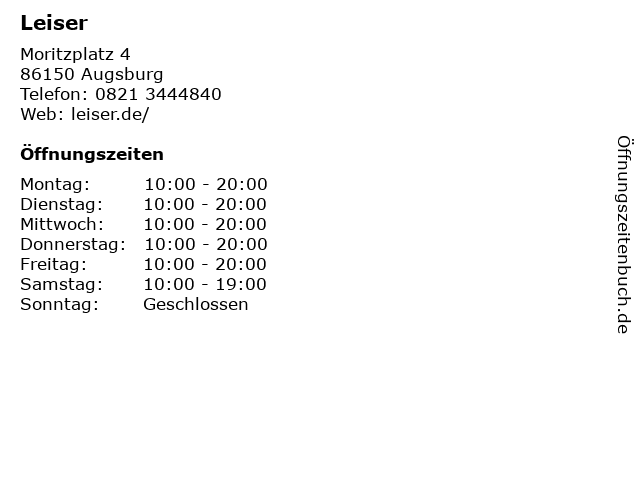 | Öffnungszeiten Leiser in Augsburg anzeigen | |