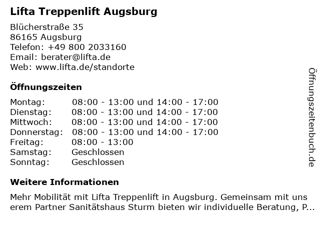 | Öffnungszeiten Lifta Treppenlift Augsburg in Augsburg anzeigen | |