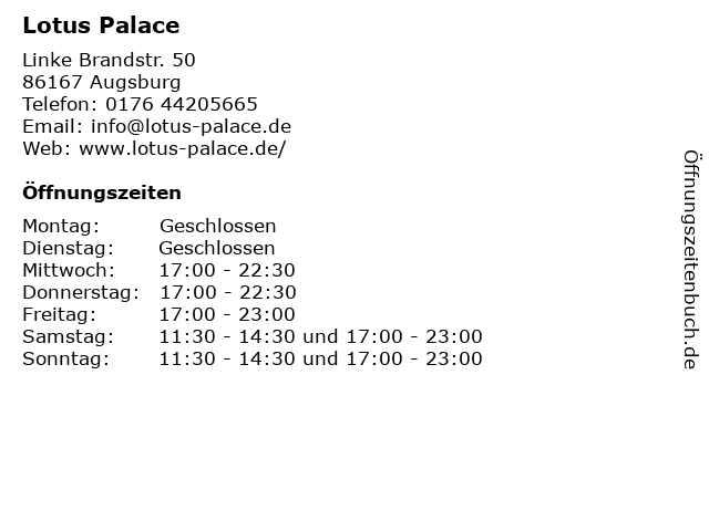 | Öffnungszeiten Lotus Palace in Augsburg anzeigen | |